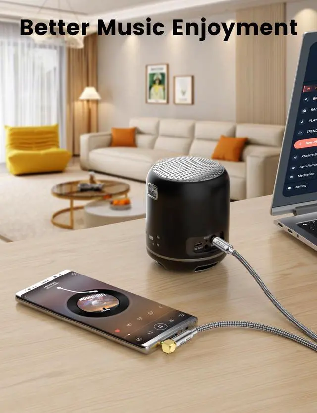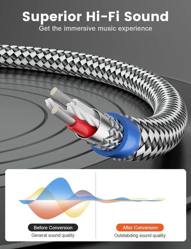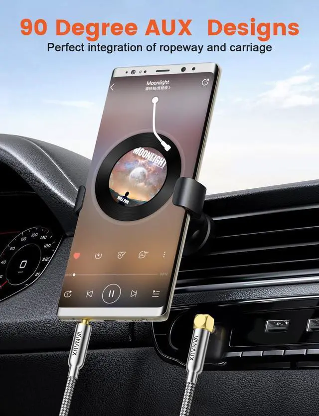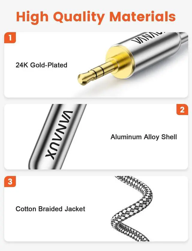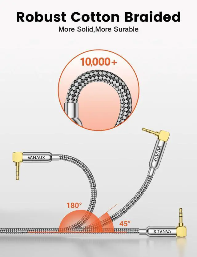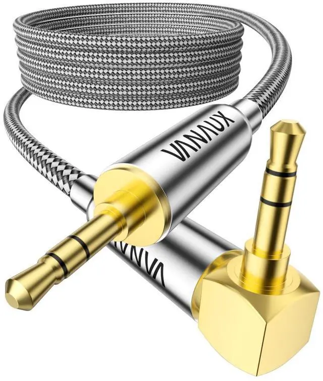 Design: The aux cable low-profile right-angle connector easily fits into tight spaces in cars trucks SUVs or behind furniture perfect for cramped dashboards center consoles or wall-mounted speakers. Avoids bending stress on your phone/device port. Hi-Fi Sound with Noise-FreeVanaux 3.5 mm audio cable features 24K gold-plated corrosion-resistant connectors oxygen-free copper cores and triple-layer shielding (aluminum housing + enamel coating + cotton braid) to eliminate static and deliver crisp bass clear mids and studio-grade audio for music podcasts or calls. Military-Grade Durability Reinforced with flexible braided cotton exterior anti-tangle PVC insulation and a tested 10 000+ bend lifespan. Aluminum alloy joints resist drops heat and car vibrations. Survives gym bags glove compartments or outdoor adventures. Case-Friendly Slim ConnectorUltra-slim 3.5 mm plug works with most slim smartphone cases (3mm thickness). For bulky OtterBox/Lifeproof cases simply detach the case onceno repeated removal needed. Universal CompatibilityWorks with car stereos Bluetooth speakers smartphones laptops headphones soundbars and MP3 players. Road-trip-ready!