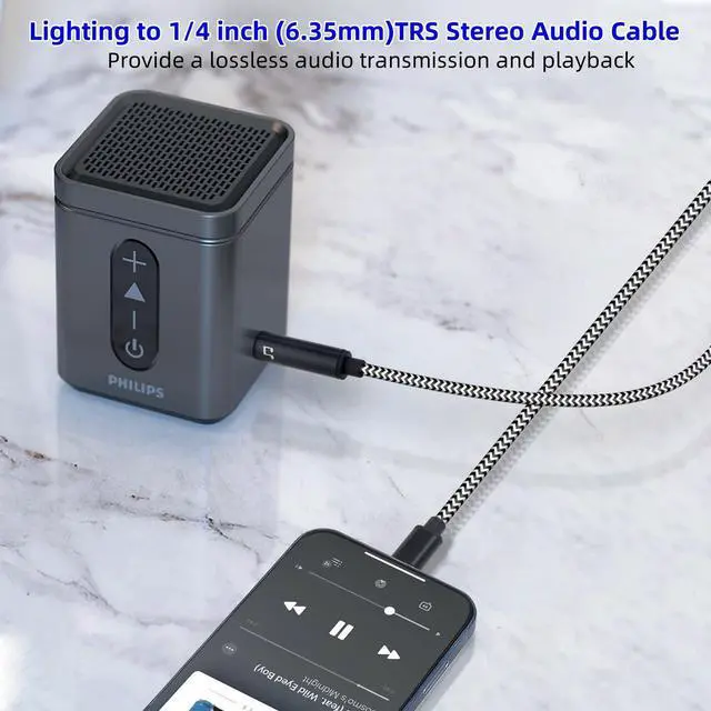High-Quality Sound: Light ning to 1/4 TRS Audio cable 24k Gold-Plated Connectors Aluminum alloy cases wear-resistant anti-corrosion and solid protection guards against harsh installs where the cable is tugged across sharp edges easily survive daily heavy usage. features with tinned-copper conductor and multi-layer shielding inside. Sampling rate up to 48KHz and filter out 98% noise crystal clear music. High quality noise free performance. Plug and PlayThis Lightn ing to 6.35 mm 1/4 TRS Audio cable is designed to facilitate the playback of i-Phone music in the home music system. You can freely play your favorite music on your speaker or car without other hardware. Easy to use stable connection Support iOS 14 version and before - No APP Needed. You dont need to worry about compatibility issues. Enjoy Excellent and