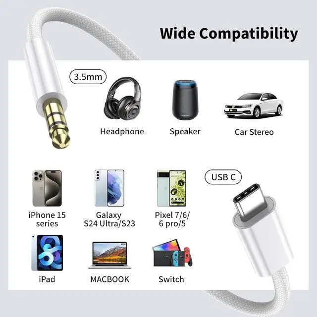 Wide Compatibility: Aux cord to usb c compatible with iPhone16 /15/16 Pro/15 Pro/16 Plus/15 Plus /16 Pro Max/15 Pro Max Galaxy S24 S24+ S24 Ultra S23 S23+ S23 Ultra S22 S22+ S22 Ultra S21 S21+ S21 Ultra S20 Z Flip S20+ S20 Ultra S10 S9 S8 Plus Note 20 ultra 10 10+ 9 8 iPad pro iPad mini 6 Mac book Google pixel 4 3 2 XL One plus 6T 7 7Pro and most other
