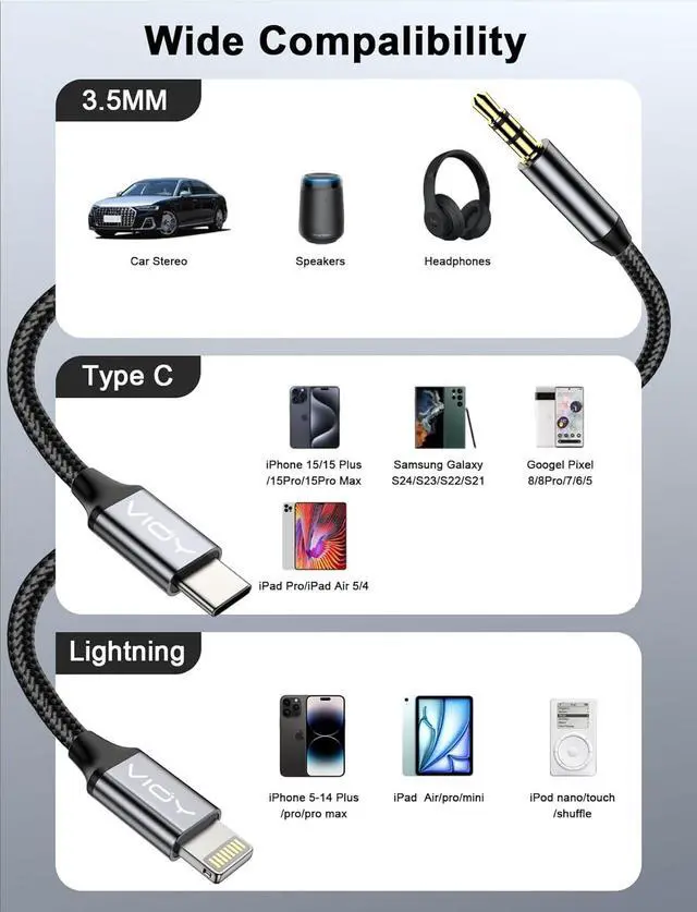 Compatibility: VIOY aux audio cable is perfect fit for most Type-C and IOS devices such as compatible with iPhone 5-16 Plus Pro Pro Max SE X XR XS Mate 30 20 10 Pro P30 P20 Galaxy S23 S23 Ultra S23+ S22 S22 Ultra S22 + S21 S21 Ultra S21+ Note20 iPad/pro/Air Mac book etcEnhanced