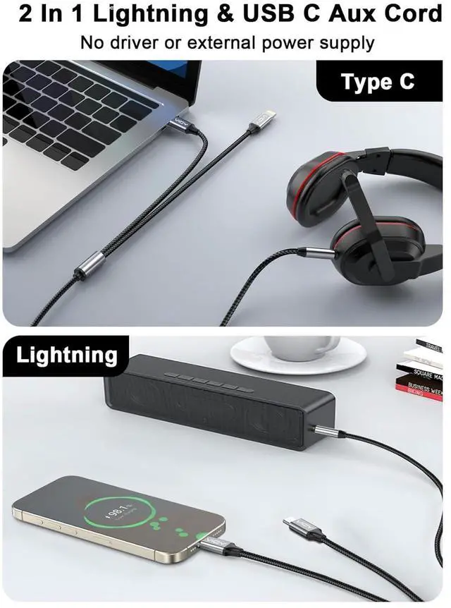 Audio Cable: This multifunctional auxiliary audio cable features a dual function design that combines USB-C and Lightning connectors with a 3.5 mm audio jack eliminating the need to purchase multiple cables for different phonesPremium