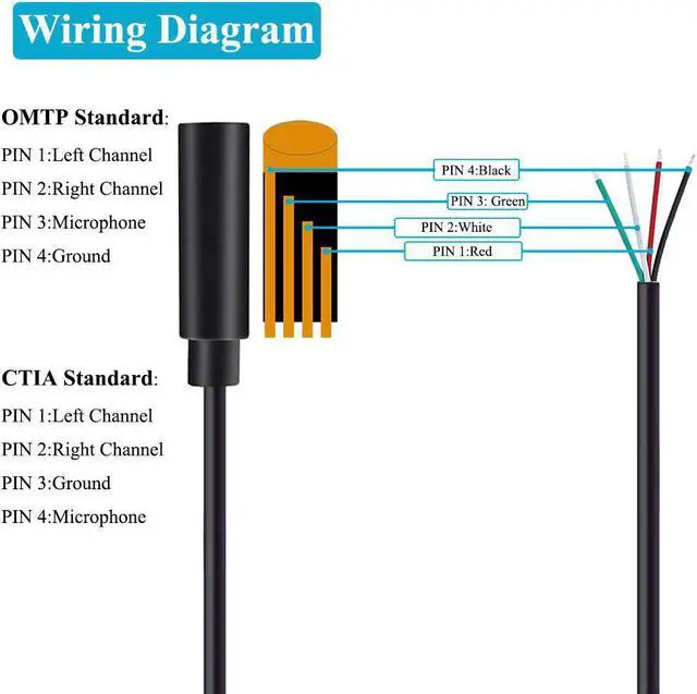 CTIA standard: PIN1 - Left channel; PIN 2 - Right channel; PIN 3 - Ground; PIN 4 - Microphone. The 3.5 mm cable comes with pre-stripped and pre-tinned ends it's very easy to be soldered and connected.