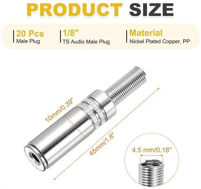 In the package of: 20 Pcs x 1/8 TS Audio Female PlugConstructed with nickel-plated copper material for superior signal clarity and a high-strength PP shell for long-lasting durability resisting wear. Provides low-noise high-fidelity audio transmission reducing interference for crisp sound quality in both professional and personal audio setups. This TS plug is only the connector part no cable. Insert the wire into the plug solder the bare wire and the plug together for a stable connection. Before purchasing please ensure that your audio equipment supports a TS mono jack.