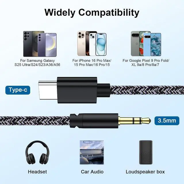 Wide Compatibility -- AUX Cable for iPhone 17 fits most type c devices compatible with iPhone 17 Pro/17 Air/17 Pro Max/16e/16/16 Pro/16 Plus/16 Pro Max/15/15 Pro/15 Plus/15 Pro Max/iPad Pro/ iPad Air/ iPad mini 6 Google Pixel 10 Pro XL/10 Pro Fold/10 Pro/9 Pro XL/9 Pro/8/7/6and more Type-C devices. Ideal for car stereos headphones speakers and home audio with a 3.5 mm jackHi-Fi Sound Quality -- With an advanced DAC chip USB Type C to 3.5 mm Stereo Jack Cable supports up to 24bit/96kHz providing high fidelity stereo audio output. The high-quality pure copper wire core provides high-speed and stable signal transmission for better and comfortable listening experienceAux to USB C Cord -- Type-C to 3.5 mm Audio AUX Jack cord can easily connect your Type C devices to car stereo home stereo speaker headphones or any device with standard 3.5 mm audio jack or Aux-in port USB C to 3.5 mm Stereo Jack Cable for iPhone 16 No need to install software drive or complex connection mode plug and play.
