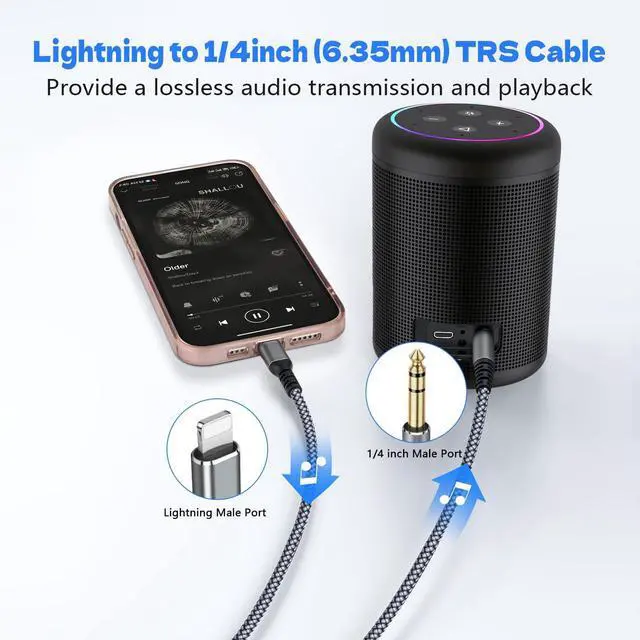 Compatibility: With its built-in smart chip the lightning quarter inch cable has a wide range of compatibility. The Lightning Port is widely compatible with i-Phone 14 / 13 / 12 / X / XS / Max / 8S / 7S compatible with i-Pad Pro/ Mi-ni / Ai-r and compatible with i-Pod. The another 1/4 Inch( 6.35 mm) Port is compatible with Amplifier Speaker Mixing Console etcTransmit