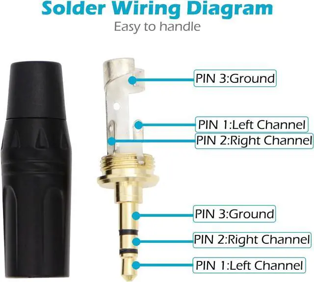 Solder wiring diagram: PIN 1 - Left channel; PIN 2 - Right channel; PIN 3 - Ground. (Refer to the 2nd product image. )Easy to handle you really don't have to be a professional to do this. Insert the cables into the sleeve solder the bare wire and the plug together and then twist and lock in place.