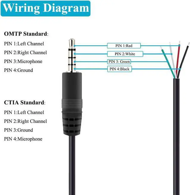 CTIA standard: PIN1 - Left channel; PIN 2 - Right channel; PIN 3 - Ground; PIN 4 - Microphone. The 3.5 mm cable comes with pre-stripped and pre-tinned ends it's very easy to be soldered and connected.