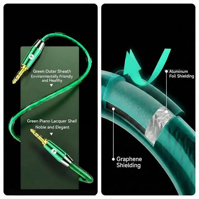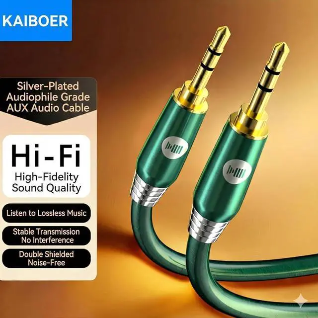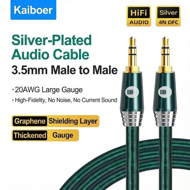 Kaiboer 3.5 mm interface audio cable 20AWG silver plated stranded copper core CNC-turned copper shell with circular cut design Gold-plated copper terminals with standing repeated insertion and removal corrosion-resistant Clear Green PVC Jacket Bring you immersive audio surround.