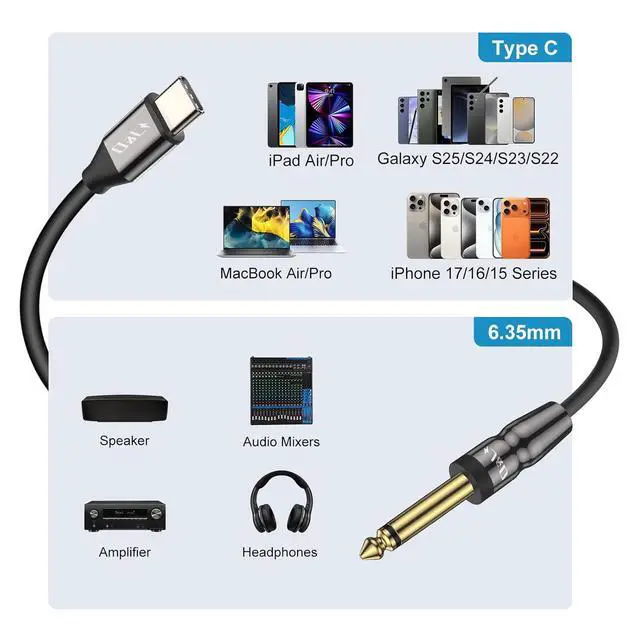 Compatibility: connects devices like smartphones tablets or laptops with USB Type-c port to devices with a 6.35 mm TS female port such as speaker amplifier condenser mic mixing console and so on; compatible with iPhone 15/16/17 series; compatible with Galaxy S24/S25 seriesHi-Fi