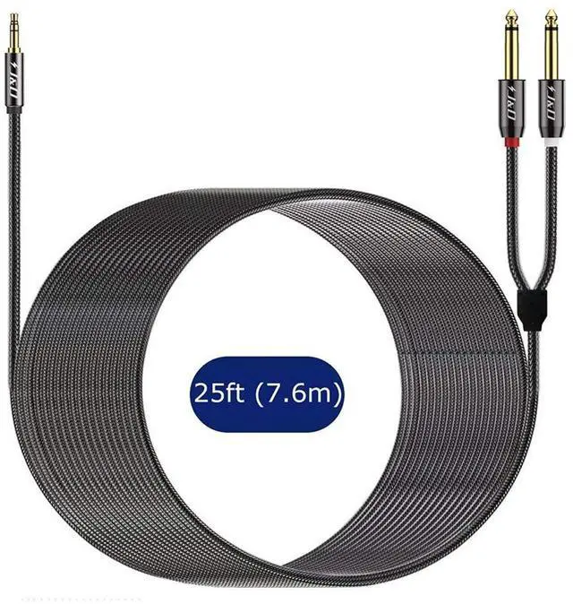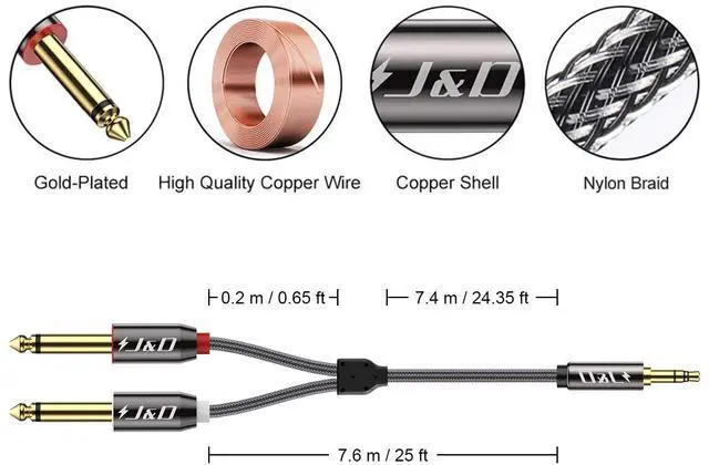 • J&D 1/8 to 1/4 Stereo Cable 3.5mm TRS to Dual 6.35mm TS Breakout Cable Y Splitter Cord for Amplifiers/Audio Mixer/Audio Recorder/MP3/MP4 Nylon Braid Gold Plated Copper Shell 25 Feet
