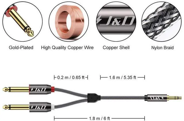 Sound: Corrosion resistant gold plated Metal connecters making the sound signal transmits with minimal signal lossComposition: 3.5 mm 1/8 inch Male to 2X 6.35 mm 1/4 inch