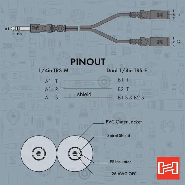 Balanced/Stereo Splitter: Splits a 1/4 TRS signal into dual 1/4 TRSF outputs.