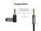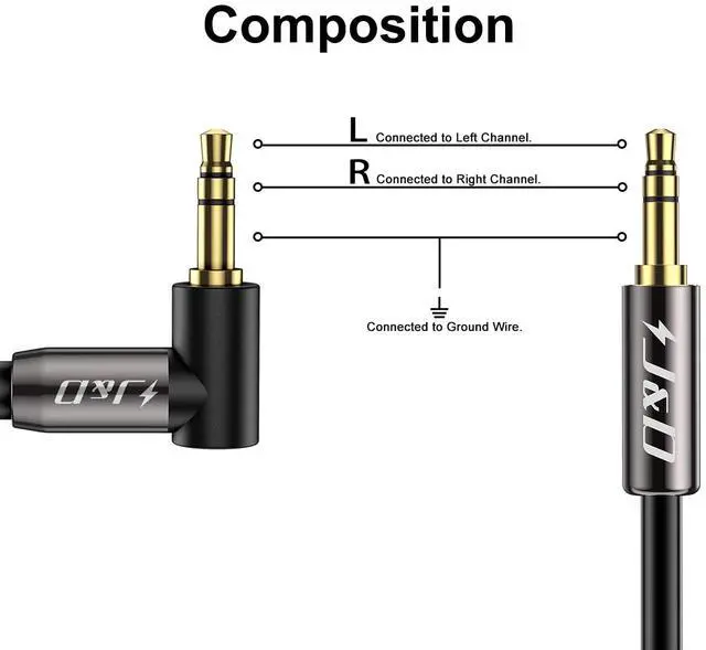 Sound: Corrosion resistant gold plated Metal connecters making the sound signal transmits with minimal signal lossComposition: 3.5 mm Male straight connector on one end and 3.5 mm Male right angled connectors on the other endWhat you get: J&D 3.5 mm to 3.5 mm right angled 12 feet cable and J&D 1-Year Limited Warranty