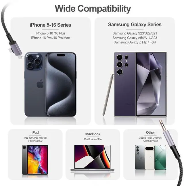 The soft nylon material makes the auxiliary cable a flexible and durable cable. The nylon braided style not only makes it look high-end and beautiful but also provides maximum durabilityWide Compatibility2 in 1 Lightning and USB C to 3.5 mm auxiliary cable can support all ios versions (including ios 10/11/12/13/14/15 and above) compatible with iPhone 16 15 14 13 12 11 XS XR X 8 7 6. Also fits most type c devices Compatible with Galaxy S24/S24+/S24 Ultra/S23/S23 Ultra/S23+/S22/S22 Ultra/S22+/S21/S21 Ultra/S21+/Note20/Note20 Ultra/S20 Ultra/S20 Google Pixel 9 Pro XL/9/9 Pro/8/8 Pro/7/7 Pro/6/6 Pro iPad mini 6/iPad Pro iPad Air 4/5 iMac Macbook Pro/Air 2023 PS5Thoughtful ServiceYou will get this USB C and Lightning to 3.5 mm auxiliary cable if you have any questions please contact us immediately to get a perfect solution