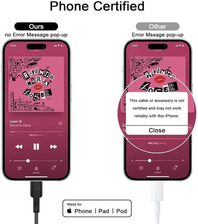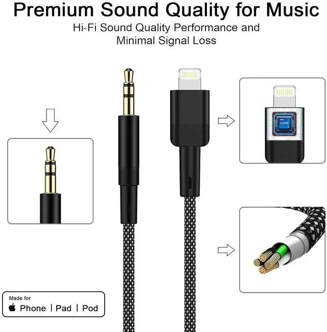 Hi-Fi Stereo SoundThis auxiliary cord for cars features a built-in advanced DAC chip and gold-plated connectors ensuring superior contact and lossless sound transmission. The Appel Phone Aux Cord delivers a clear uninterrupted audio experience providing you with an exceptional music journey when using this Lightening to Aux Cable! Plug and PlayNo damage to your Phone is incurred; there is no need for any drivers or external power simply plug in and play. Designed for everyday use this Phone 3.5 mm aux cord has a length of 6 feet ( 1.83 meter) making it easy to store in your pocket or travel bag.