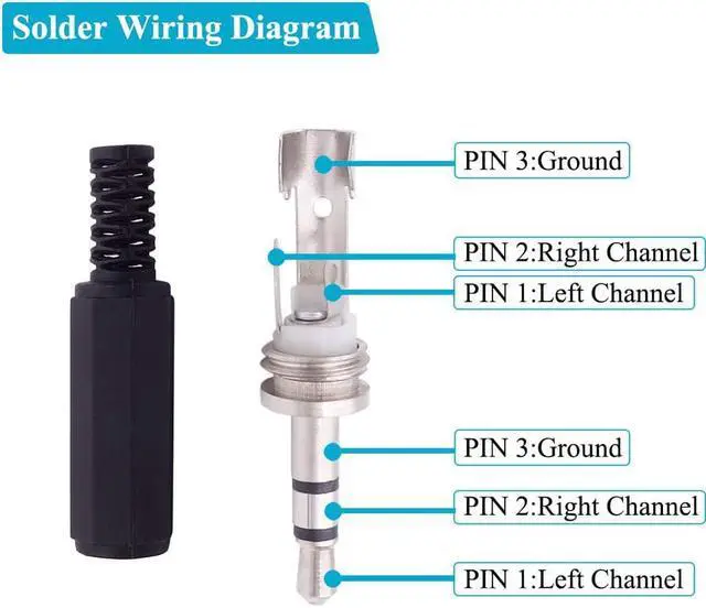 Solder wiring diagram: PIN 1 - Left channel; PIN 2 - Right channel; PIN 3 - Ground. (Refer to the 2nd product image. ) Suitable for cable with diameter up to 5mm. Easy to handle you really don't have to be a professional to do this. Insert the cables into the sleeve solder the bare wire and the plug together and then twist and lock in place.