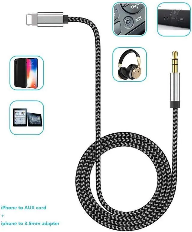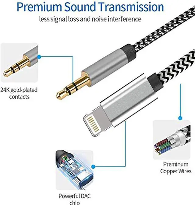HiFi and DurabilityThe aux cord has a length of 3ft /1 Meter With textured aluminum head and premium nylon braided cable material makes the lighting aux cord to be strong but flexible and easily survive everyday heavy usage. aux cord for iPhone made with Nickel-plated connector and built-in powerful DAC chip that delivers optimal signal with lower distortion providing high fidelity stereo audio output and the cleanest sound experience. More ApplicationsThe Cable supports iPhone EarPods/Earbuds and most brand headphones with 3.5 mm audio jack like Beats Sony Audio-Technica and more. Output Music from lightning devices to Car Stereo Home Audio or Speakers.