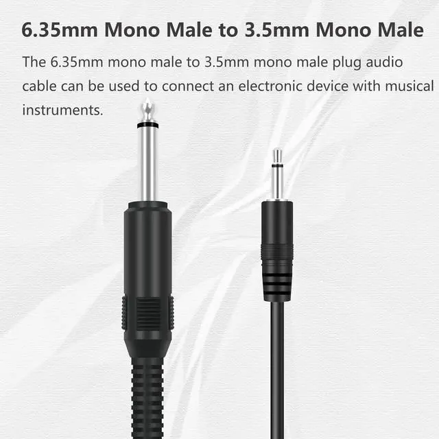 This is an audio cable of 3.5 mm 1/8 inch TS mono male to 6.35 mm 1/4 inch mono male. The 6.35 mm mono male to 3.5 mm mono male audio cable is convenient to connect devices with standard 3.5 mm plug to audio devices with a 6.35 mm mono jack adapter. The 3.5 mm male to 6.35 mm male mono audio cable is used to transfer audio between 3.5 mm devices and 6.35 mm devices such as headphones to pocket talker speaker amplifier guitar piano mixing console home theater AV receivers microphone to external soundcard etc.