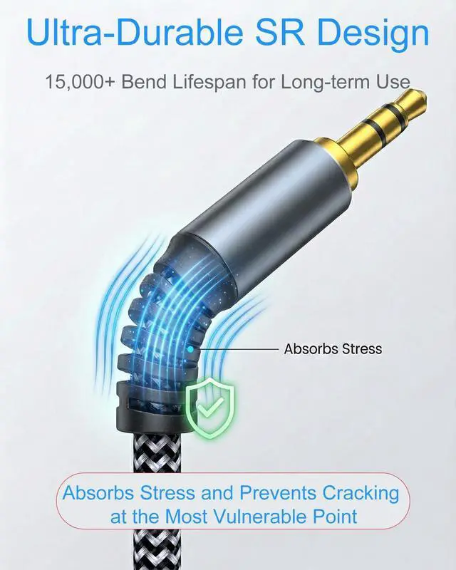 Weve eliminated the most common failure point. Unlike standard cords that transition abruptly and snap easily our cable features an elongated highly flexible SR transition zone. It absorbs sharp bends preventing casing cracking and internal wire failure[FLAWLESS HI-FI AUDIO & NO STATIC] Built with 24K gold-plated connectors and double-shielded oxygen-free copper (OFC) this premium 3.5 mm audio cable effectively blocks out EMI/RFI interference and car engine noise. Experience crystal-clear buzzing-free stereo sound that a standard audio cable simply can't deliver. [WORKS WITH STANDARD 3.5MM AUX PORTS] Seamlessly connect your devices with this premium aux cord.