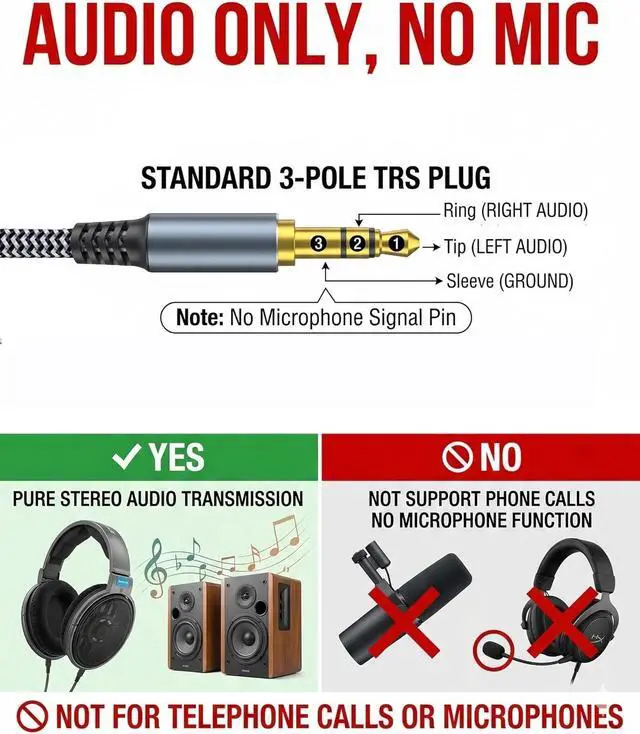 [AUDIO ONLY - NO MIC OR REMOTE] This 3.5 mm male to male aux cord uses a 3-pole TRS connector for stereo audio only. It does not support microphone phone calls inline volume control or media controls. A practical replacement for a worn headphone cord when you only need reliable music playback[THE ULTIMATE CAR AUDIO COMPANION] Don't let spotty Bluetooth ruin your drive. Perfect for 2010-2018 vehicles this aux cord for car provides an instant rock-solid connection from your phone to your car stereo. As a dependable auxiliary cord it ensures road trips with zero audio drops no pairing headaches and no battery drain[REDESIGNED SR TAPERED JOINT] Tired of replacing your aux cable every few months? Encased in a tangle-free nylon braided jacket with reinforced strain relief boots this auxiliary cable boasts a 15 000+ bend lifespan.