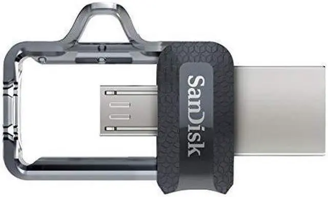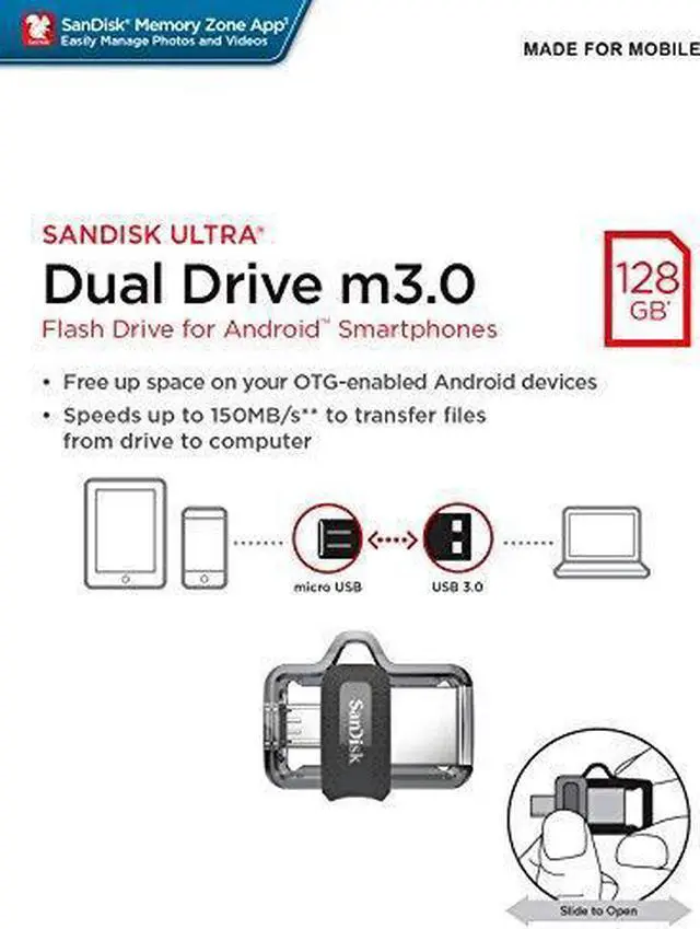 The SanDisk Ultra Dual Drive m3.0 makes it easy to free up space on your OTG-enabled Android smartphone and tablet(1). With a micro-USB connector on one end and a USB 3.0 connector on the other the drive lets you move content easily between all your devices—from your Android smartphone or tablet to your laptop PC or Mac computer(1). The high-performance USB 3.0 connector is backward-compatible with USB 2.0 ports and with speeds of up to 150MB/s* it allows you transfer a full-length movie to the drive faster than with a standard USB 2.0 drive(3). This flash drive for your Android devices includes the SanDisk Memory Zone app for automatic camera roll backup and easy file and media management(2). | *(32GB-256GB) Read speeds from drive to computer up to 150MB/s. (16GB only) Read speeds from drive to computer up to 130MB/s. Write speeds lower and vary by drive capacity. USB 3.0 port required. Based on internal testing; performance may be lower depending upon host device. 1MB=1000000 bytes. | **1GB=1000000000 bytes. Actual user storage less. | (1) Requires device with On-The-Go (OTG) support. | (2) Download and installation required. | (3) Based on a 1.2GB MPEG-4 video transfer with USB 3.0 host device. Results may vary based on host device file attributes and other factors.