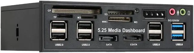 Packagelist: 1 * 5.25" Internal SATA e-SATA Dual USB 3.0 Six USB 2.0 Five-in-one Card Reader Multi-Function Front Panel Media Dashboard 4 * Screw 1 *