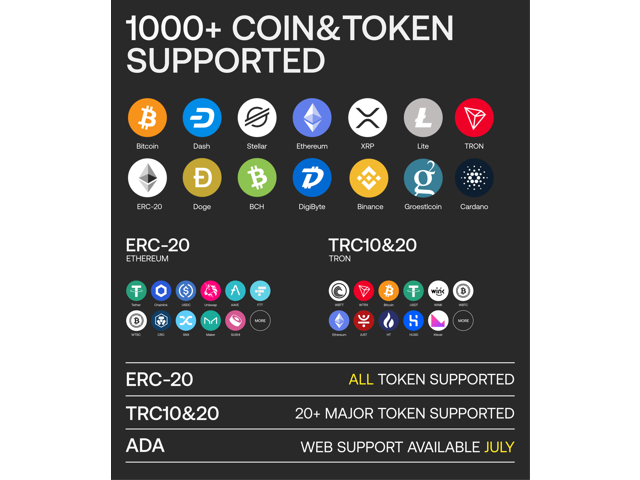 - Support 1000+ crypto coins/tokens including all ERC-20/TRC-10/TRC-20/BEP-20 Tokens