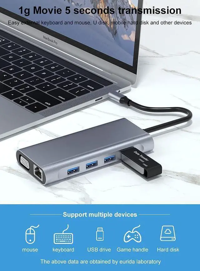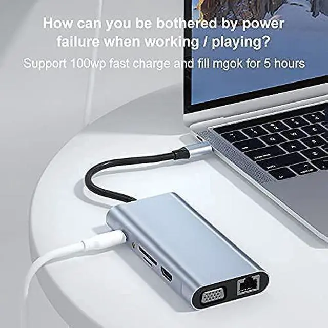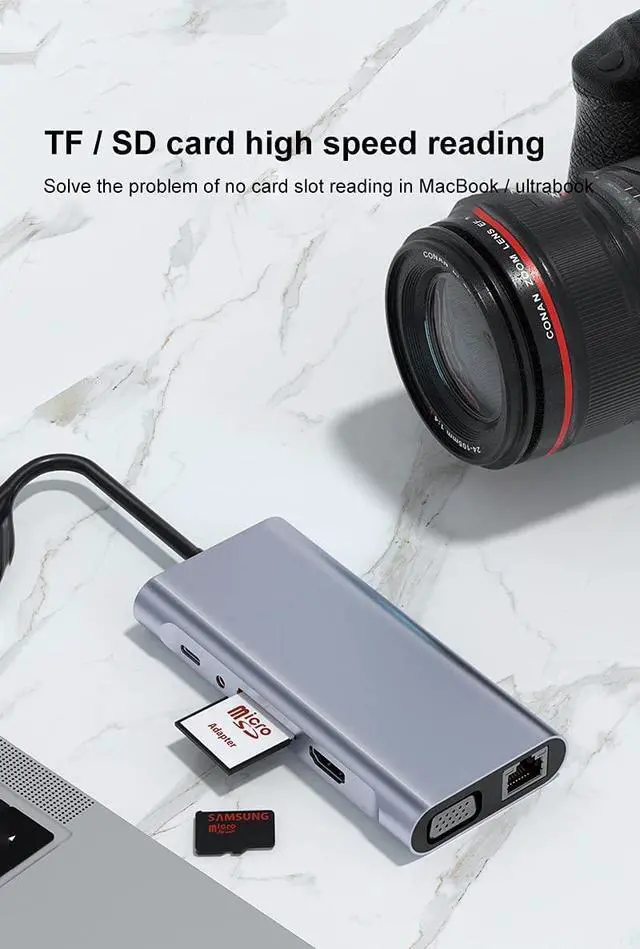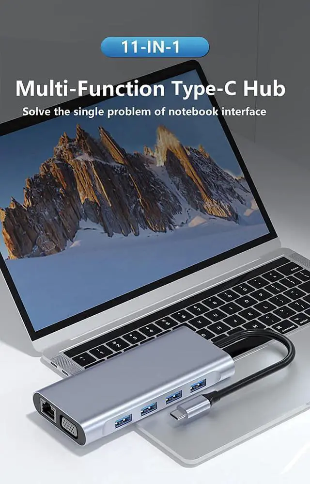 : USB 3.0*1+USB 2.0*3+USB C PD charging+HDMI 4K HD+VGA+SD+TF+DC 3.5 audio+RJ45 100M