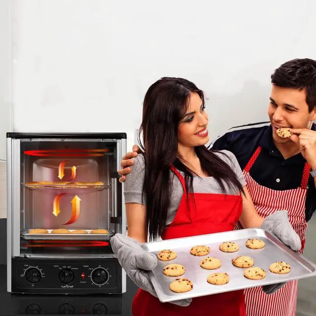 The process is effortless. The multi-function oven has the ability to bake, roast, broil, or cook rotisserie foods. With the included racks and pans, make cookies, chicken, kabobs, potatoes, or veggies. The options are endless. Simply insert your chosen fan-favorite food, set the time and temperature on the rotary dials, and let the convection air cooker do the rest. You'll have a delicious meal in no time.