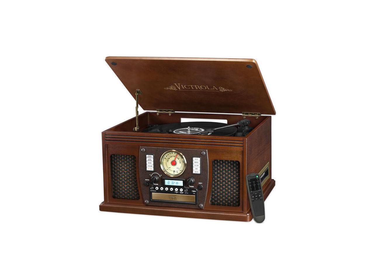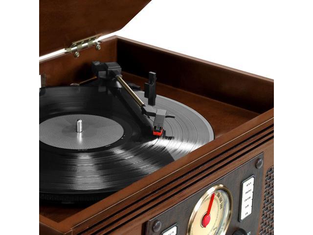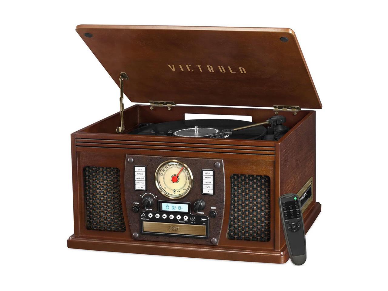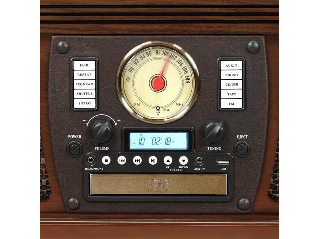 - 8-in-1 ENTERTAINMENT CENTER With vintage looks & modern features, this turntable not only plays your Vinyls, but also has a CD & cassette player, FM radio, Bluetooth, and Aux & headphone jack for audio streaming from your smartphone
