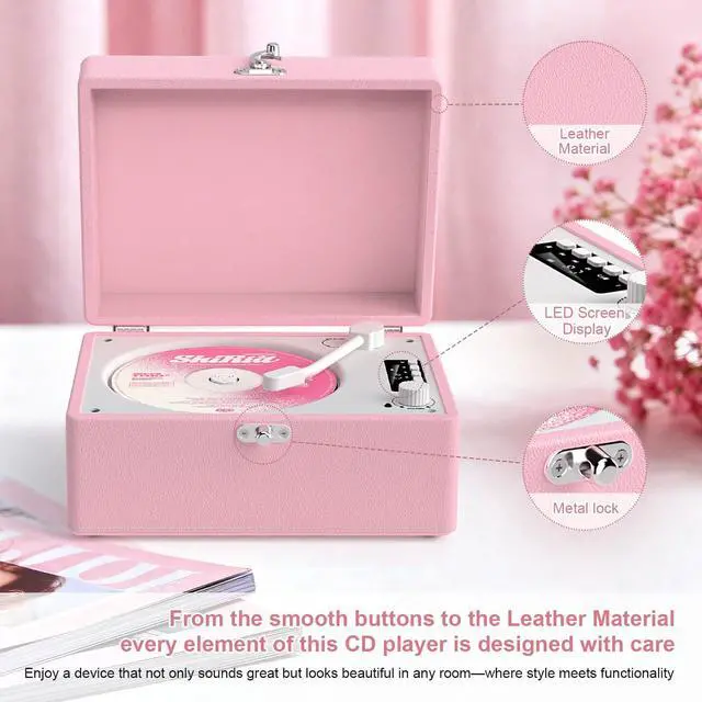 CD Player Portable Bluetooth, Pink Retro CD Player Leather for Home Music Player, Rechargeable Battery & Built-in Speakers, USB & AUX Playback, Festival Gift for Home, No Remote Control(Light Pink)