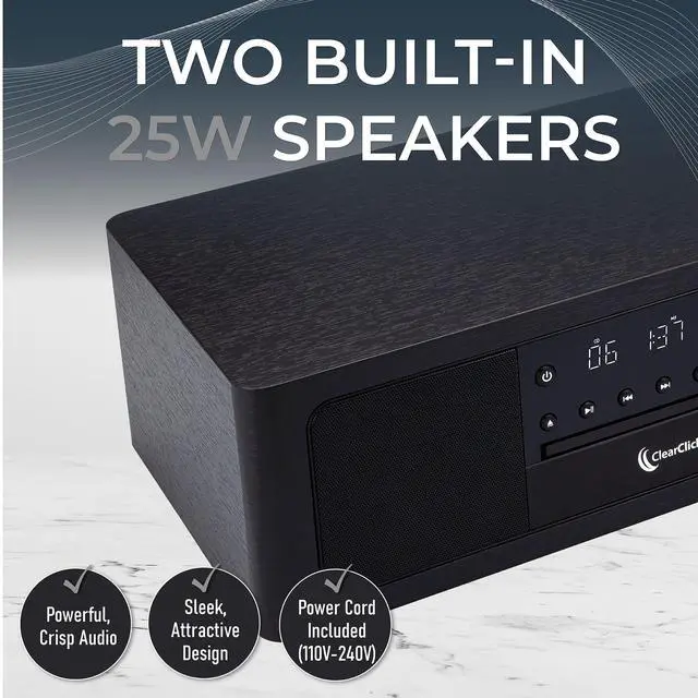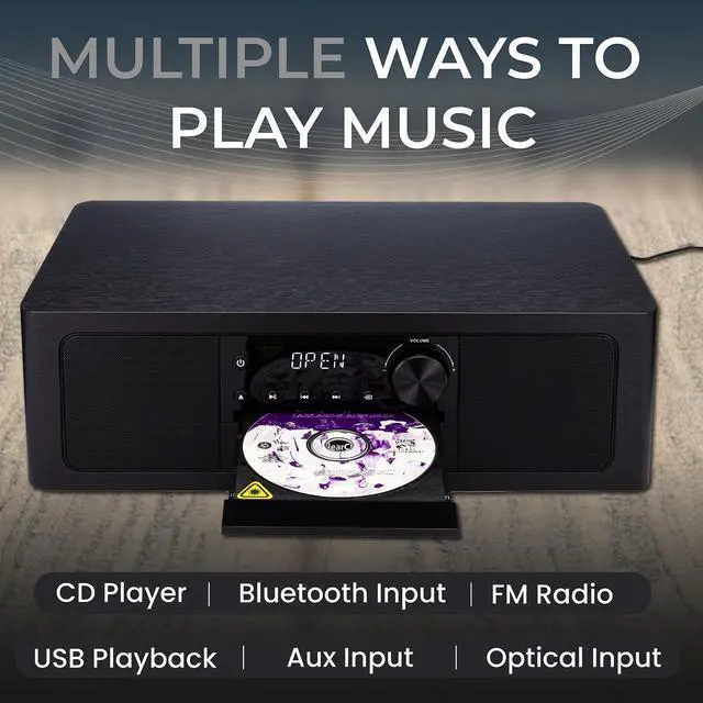 Enjoy your CD collection with the built-in CD player. Or connect your phone, tablet, or computer to the speaker with its wireless Bluetooth connectivity. The built-in FM radio function offers access to a wide range of radio stations, providing endless entertainment options. Equipped with an optical input, this system enables high-quality audio connections from your TV or other digital devices. You can also play music from a USB flash drive (not included) or optical or aux in.