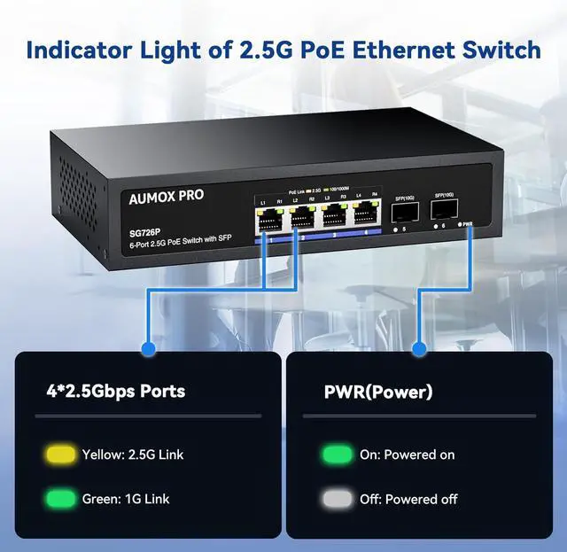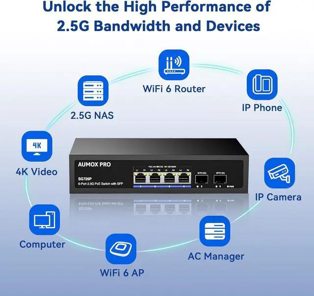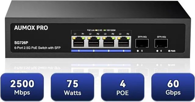 75W PoE SwitchAUMOX PRO 2.5 gb network switch equipped with 4 802.3 af/at PoE ports with up to 30W for each port, data, and power can be transferred on one single cable. It supports PoE power up to 75W for all PoE ports
