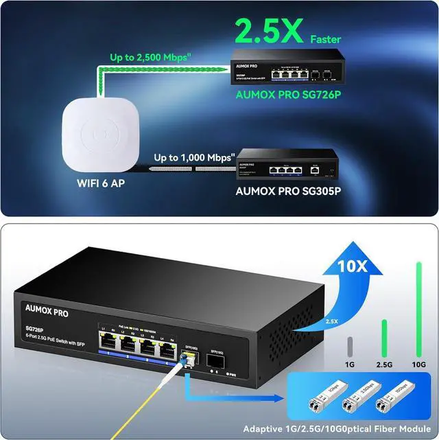 2.5G Port, Superior Performance. 4× 2.5 -Gigabit ports unlock the highest performance of your Multi-Gig bandwidth and devices, and provide up to 60 Gbps of switching capacity. And 2*100/ 1000/ 2500/ 10000 Mbps SFP slots, all ports support wire-speed forwarding, capable for high-speed network requirements