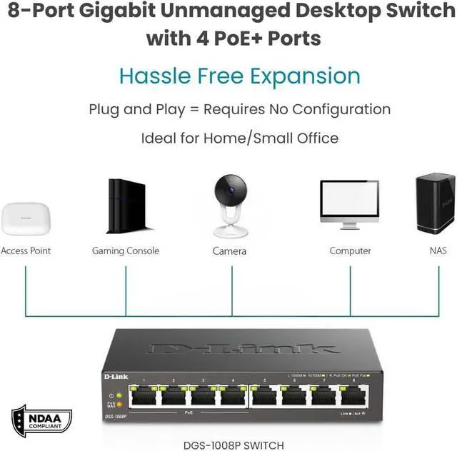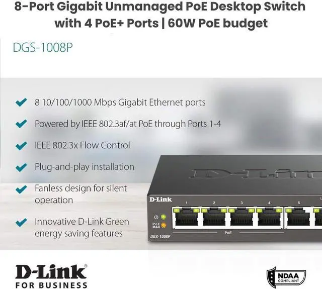 Ultra-quiet, compact design for home and office use 4 ports provide PoE up to 15.4W for a total PoE budget of 52W No special networking cables required Supports IEEE 802.3 af Quick, simple Plug-and-Play installation