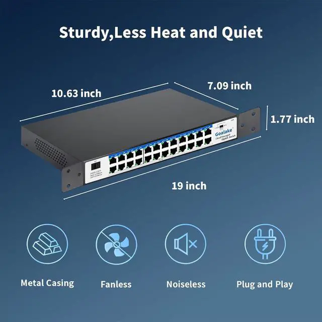 Robust Metal Construction: Featuring a sturdy metal casing and industrial grade fan design, goalake network switch ensures heat dissipation while reduce noise. This combination ensures longer-lasting operation in a wide range of temperature environments, making the switch run more stable and reliable. Plus, its versatile design allows for desktop or wall mounting, making installation easily.