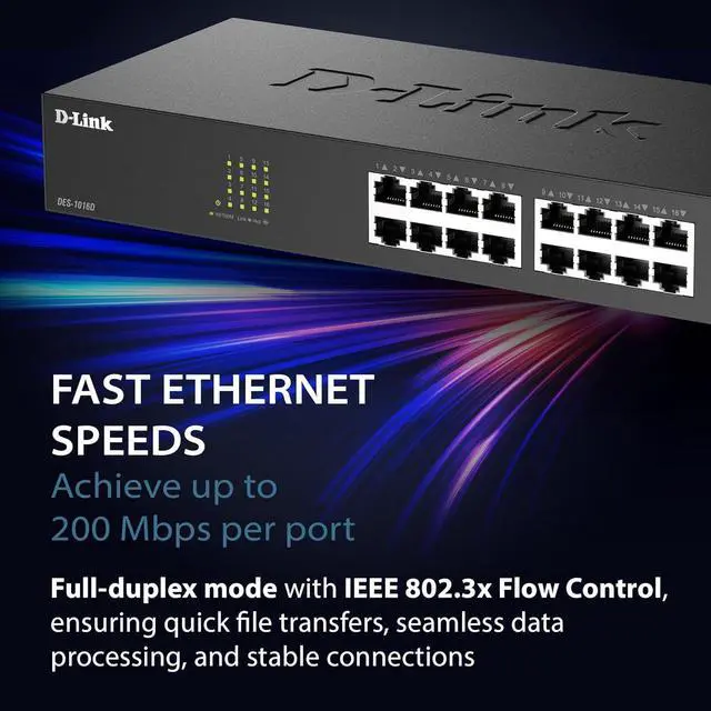 FAST ETHERNET SPEEDS Achieve up to 200 Mbps per port in full-duplex mode with IEEE 802.3 x Flow Control, ensuring quick file transfers, seamless data processing, and stable connections to boost network performance and uptime