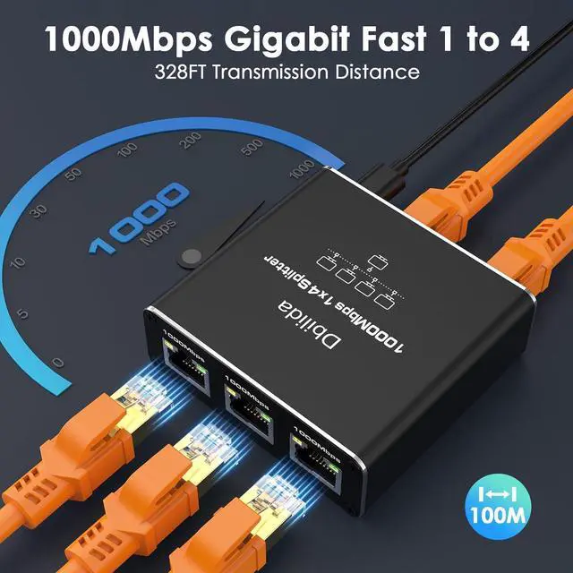 • Power Supply Required & 328FT TransmissionDbilida network splitter 1 to 4 requires 5V/1A power supply. This RJ45 splitter 1 to 4 support 328FT/100M transmission distance. Whether you're using it at home, in the office, or anywhere that requires multiple network simultaneous conn