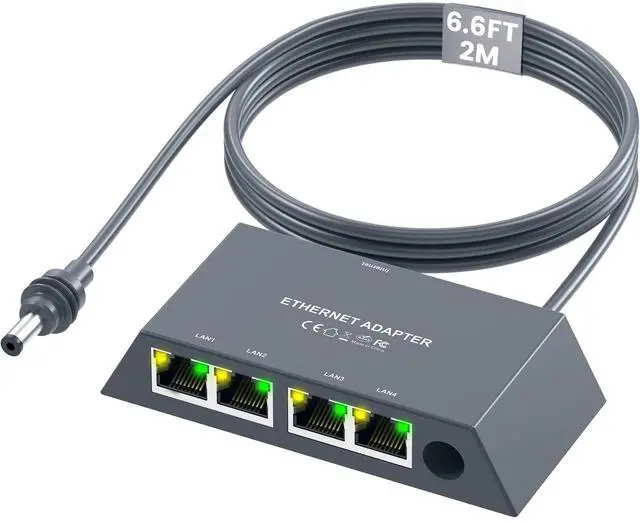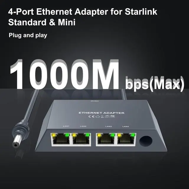 Product Overview: Designed for Starlink Gen 3 and Mini satellite routers, our 4-Port Gigabit Ethernet Adapter features RJ45 ports to maximize V3 Starlink network performance. With four Gigabit Ethernet ports, connect multiple devices simultaneously including desktops, smart TVs, laptops, and other third-party equipment. Enjoy wired speeds up to 1Gbps, significantly reducing Wi-Fi instability and high latency. Whether gaming, streaming 4K/8K video, or attending critical remote meetings, this adapter delivers fast, stable, and reliable connectivity. Use Cases: 1.4K/8K Home Theater: Connect smart TV + NAS/Blu-ray player concurrently 2.Multi-Device Networking: Share bandwidth for work/entertainment/gaming 3.Competitive Gaming: Wired connection to PS5/Xbox/PC reduces ping below 10ms 4.Satellite Remote Work: Ensures stable video conferencing 5.Large File Transfers Specifications: Ports: 4× Gigabit RJ45 Ethernet Speed: Up to 1Gbps Compatibility: Starlink Gen 3 / Mini satellite routers Cable Length: 2M / 6.6FT Package Contents: Multi-port adapter ×1, User manual ×1 Key Features: Ultra-Low Latency: Optimized for gaming/streaming Compact & Energy-Efficient: Durable minimalist design Plug-and-Play Setup: Ready in seconds Gen 3 Router Optimized: Fully compatible with Starlink Gen3 router