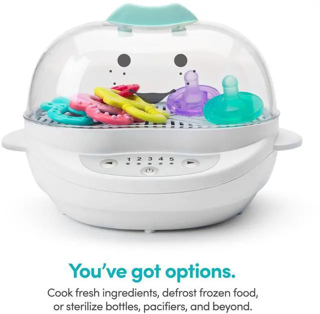 Quickly steam fresh fruits and veggies, defrost batch-cooked baby food, and even sterilize bottles, binkies and more; this versatile steamer does it all.