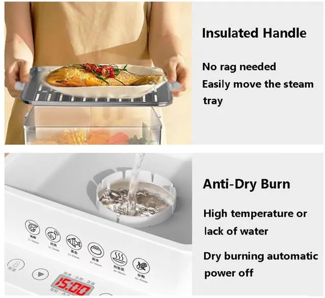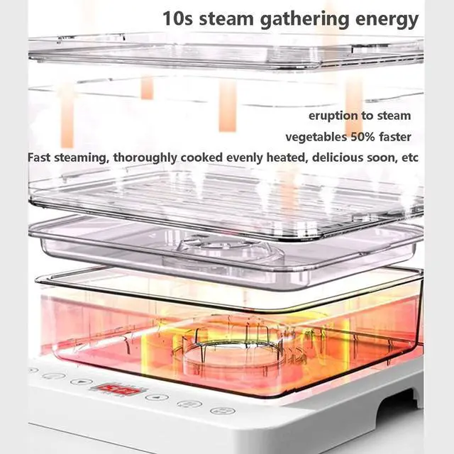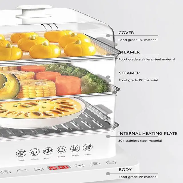 This food steamer has a 40 litre capacity and 3 separate steam containers made from food-safe materials for safe and healthy cooking, and the removable steam plate allows food to be placed higher. FEATURES: - 12 hours automatic heat preservation, humanized handle, heat insulation and not hot - 40L Visible steam tray, the progress of delicious food is clear at a glance - 6 preset menu programs, one-key steaming of different delicacies - Stacked storage, easy to store and save space - Sauce tray catches soup and is easy to clean. SPECIFICATION: Product name: three-layer electric steamer Nominal capacity: 3 layers/40L Rated power: 800 W Reservation: 12.00 hours Function: multifunctional steaming, reservation, timing Product size: 320*322*400mm Weight: 3.5 kg Packing list: steamer*1/stainless steel steam tray*3/steam cover*1/drain tray*1/manual*1. PACKING LIST: 1* Electric Food Steamer If you have any questions, please contact us, we will reply you within 24 houses