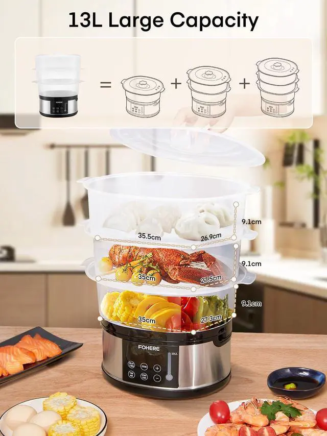 Large capacity and easy to storeThe 13.7QT large capacity steam pot is equipped with 3 layers of independent food steamers, which can steam a variety of foods at the same time. Note: The smallest steamer is placed at the bottom and stacked up in sequence. The veggie steamer is stackable, which is a good space saver and easy to store on the countertop, cabinet or pantry, which is the best fit for your kitchen.