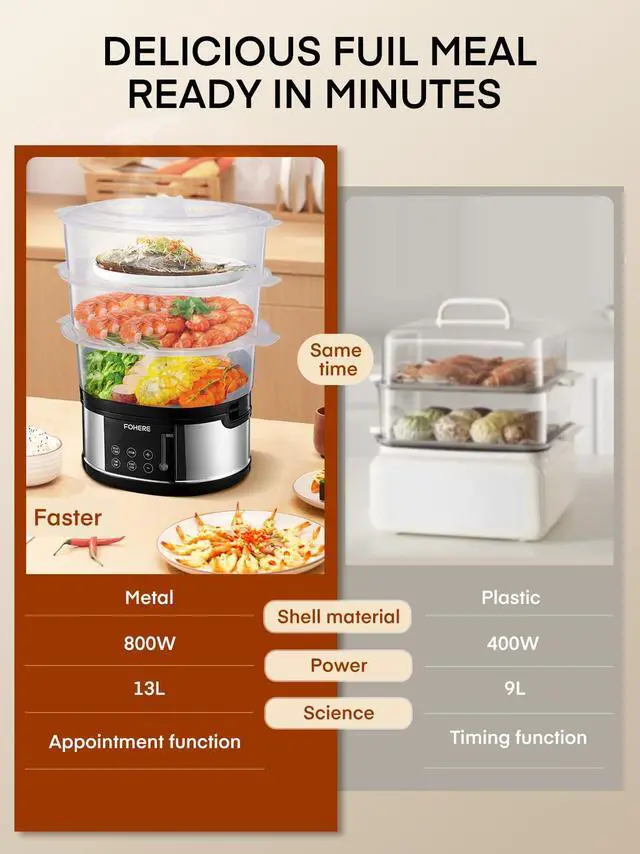 Fast cookingThe steamer for cooking has a unique steam accelerator that can quickly produce steam in 1 minute. 800W turbo steam cycle and unique steam hole design, which can better penetrate steam and heat evenly, you can cook food on multiple levels at once, saving your time, energy and money.