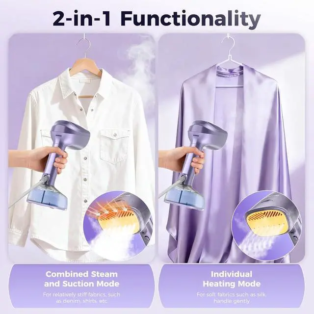 Multiple modes suitable for various fabricsThe dry ironing function is suitable for handling sharp wrinkles and shaping collars without the need for water; the low steam mode is ideal for delicate silks and synthetic fabrics; the high steam mode is suitable for handling heavier fabrics such as denim and linen. This garment steamer is the ultimate versatile tool for your wardrobe, ensuring perfect results every time.