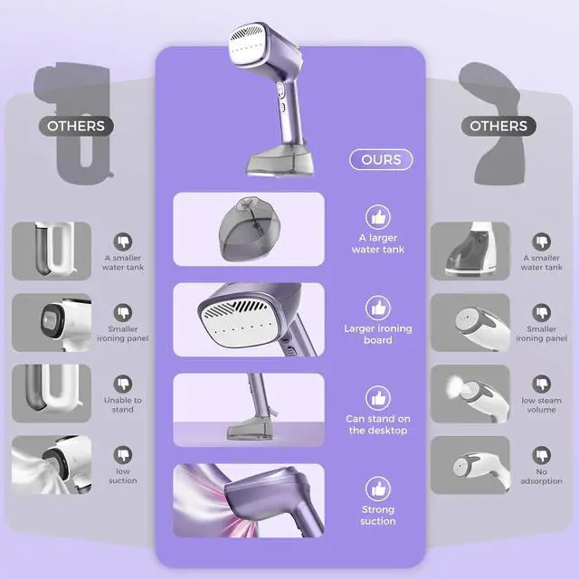 3500Pa Vacuum Suction TechnologyEasy to use with one hand, equipped with an automatic suction feature, no need to struggle with stubborn fabrics or rely on an ironing board. Our garment vacuum steamer has a powerful 3500Pa suction, capable of automatically adhering to any hanging clothing. This innovative hands-free system allows you to comfortably operate it with one hand and even handle complex seams and edges. It offers ultimate safety and convenience, virtually eliminating the risk of burns