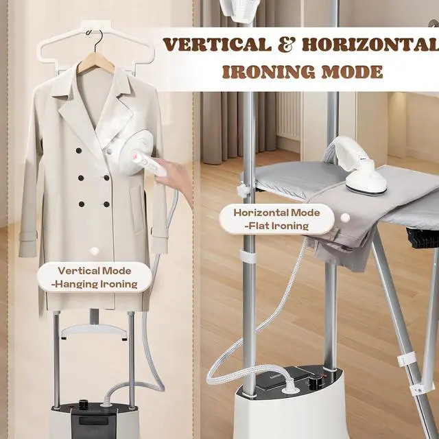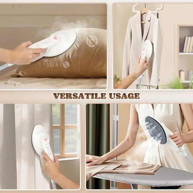 3-in-1 Ironing Board: Professional garment steamer offers three ironing modes - Flat ironing for shaping, Hanging ironing for draping, and Straight ironing for precise detailing. Triple atomized ultra-penetration technology ensures deep moisture penetration into fabric fibers, making ironing easier and more effective