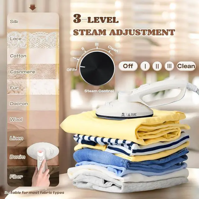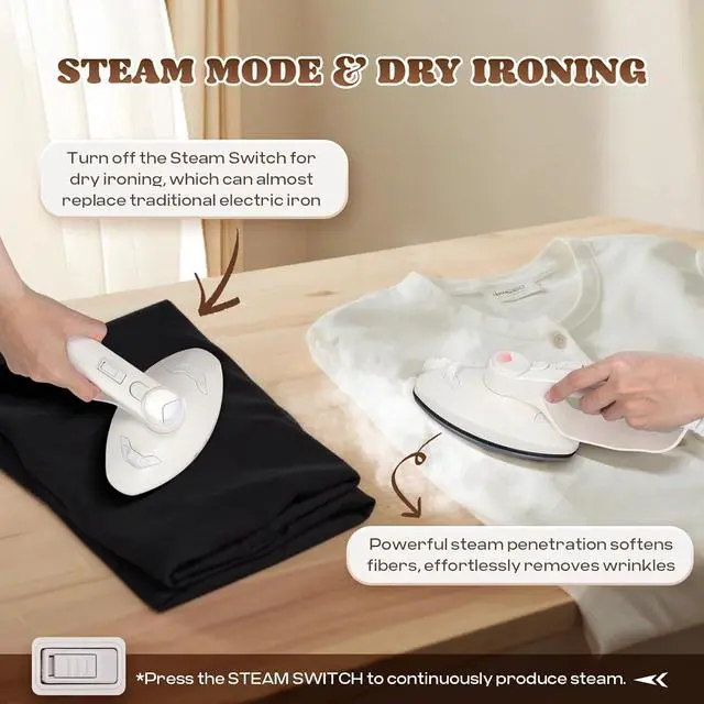 Steam Modes & Dry Ironing: Adjust three levels of steam intensity to iron different fbric types, such as shirts, jeans, jackets, suits, curtains, mattresses, etc. To release steam continuously, push the Self-locking Button on the Steam Switch backward to lock it. And you can also turn off the Steam Switch for dry ironing, which can almost replace traditional electric iron