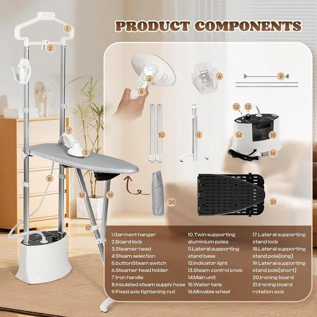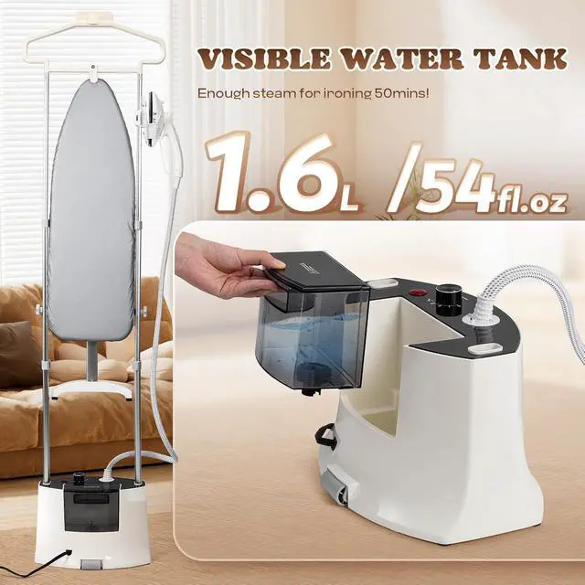 Moongiantgo Standing Steamer for Clothes with Foldable Ironing Board, 1500W Professional Vertical Garment Steamer with 90° Flex Ironing Head, 1.6L/54 fl.oz Water Tank Fabric Steamer Adjustable Steam