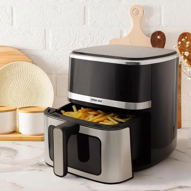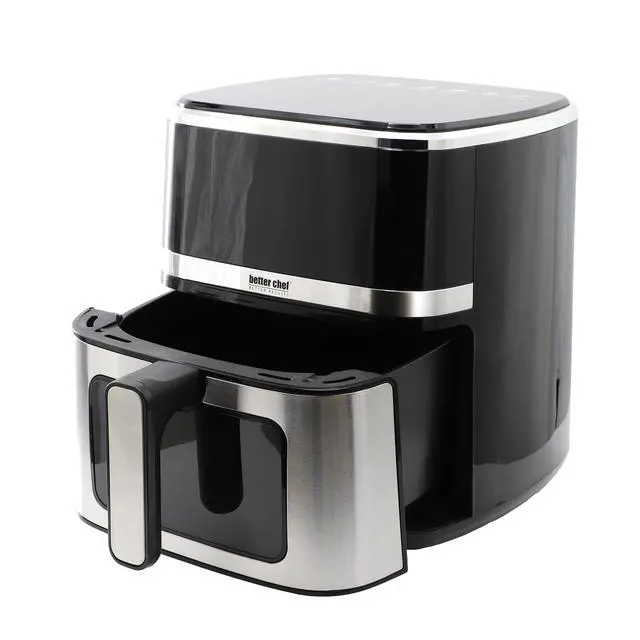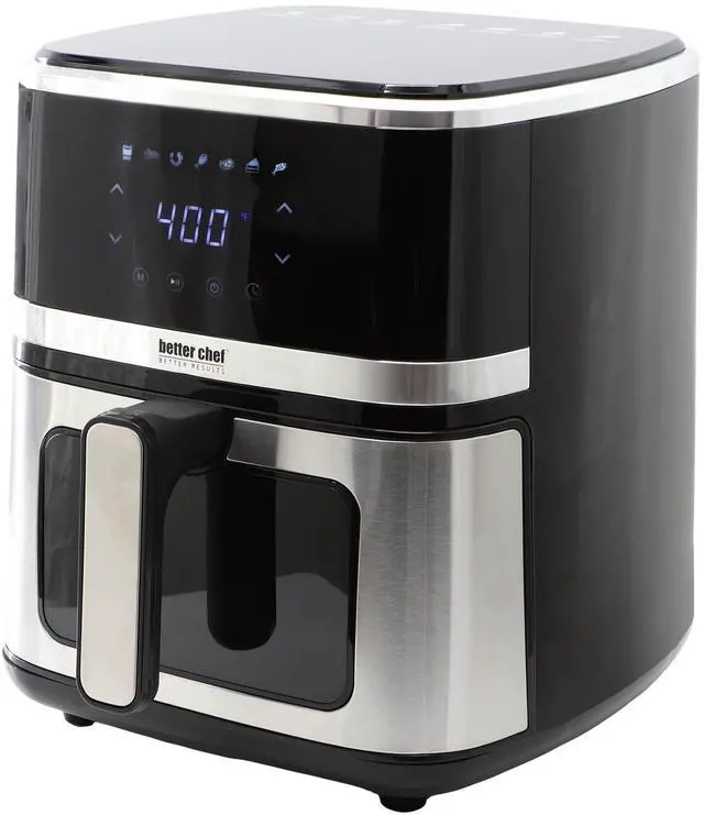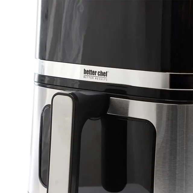 The Better Chef 5.3 Quart Digital Display Air Fryer with Touch Controls in Silver offers a convenient and efficient way to prepare your favorite meals with little to no oil. Powered by 1350 watts (120V/60Hz), this air fryer features a generous 5.3 quart (5 liter) capacity, making it ideal for family meals or entertaining. The sleek LED touch display and digital controls allow for easy operation, while stainless steel accents add a modern touch to any kitchen.