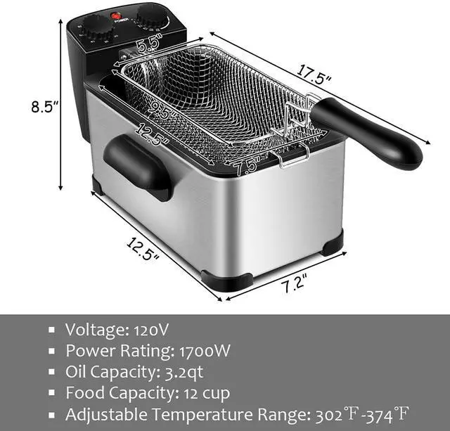 Featuring a 3.2-quart oil container with max and min oil level and 1700W high performance heating element, our deep fryer can fry food quickly and reach the perfect crisp. Besides, it has adjustable temperature, from 302 degree F to 374 degree Fand 60-minutes timer so that you can set the temperature and time according to your actual needs. Lid with view window not only prevents hot oil splash, but also allows you to keep an eye on the frying process. Anti-slip pads at the bottom increase stability. The designs of removable heating element, non-stick enamel-coated inner, fry basket with hook and round corner make it easy to clean. The anti-scalding cool touch handles make it easy to hold. It is worth mentioning that it is certified by UL.